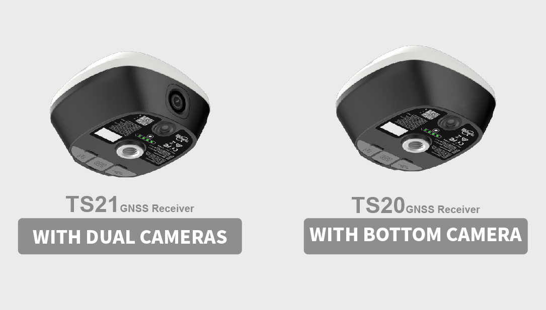 TS21 and TS20 are smart antennas with identical form factors. TS21 features a front and bottom camera — the front camera enables visual positioning, while both cameras work together for AR stakeout, making it suitable for diverse scenarios. TS20 has a single bottom camera dedicated to AR stakeout, designed specifically for stakeout tasks.